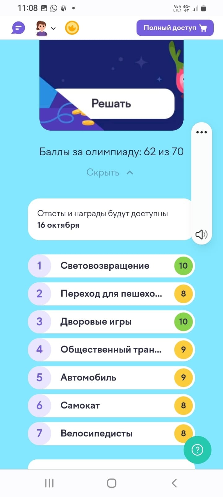 21.10.202319 сентября по 15 октября прошла Всероссийская онлайн-олимпиада «Безопасные дороги». Ставшее уже ежегодным онлайн-состязание проверяет и повышает дорожную грамотность учеников 1-9 классов